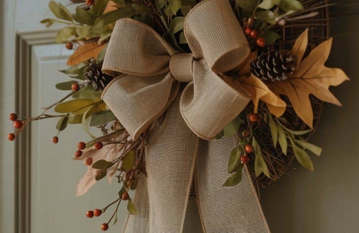 A large burlap bow accented with faux fall foliage—such as colorful leaves, red berries, or tiny pinecones—adds softness, warmth, and dimension to your door décor. Attach this bow either at the top center of your wreath or off to one side for an asymmetrical design that lends visual interest.
