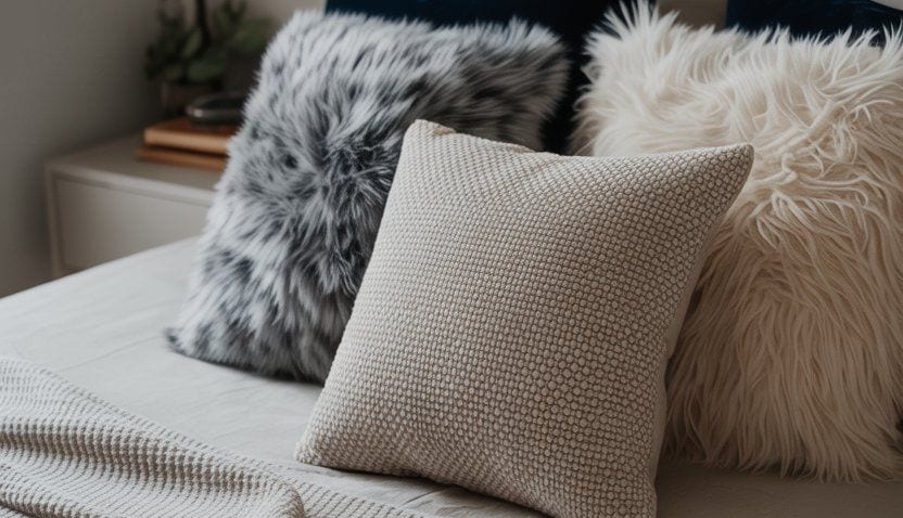 Cozy winter bedroom decor: plush pillows and textured throw blanket on a bed.